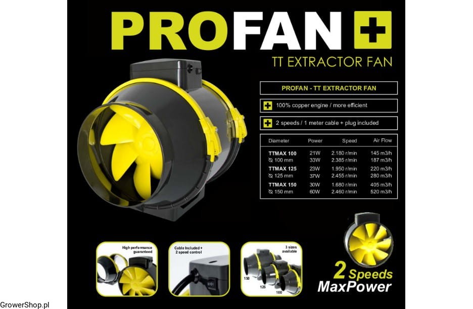 Cichy wentylator dwubiegowy PROFAN TT 100mm do growboxa. Gotowy do użycia.