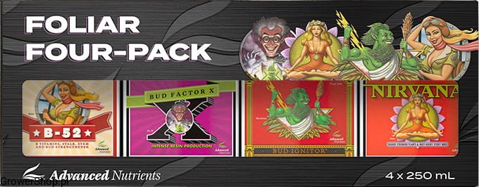 Foliar Four-Pack firmy Advanced Nutrients składa się z 250 ml Bud Ignitora, 250 ml B-52, 250 ml Bud Factor X i 250 ml Nirvany.