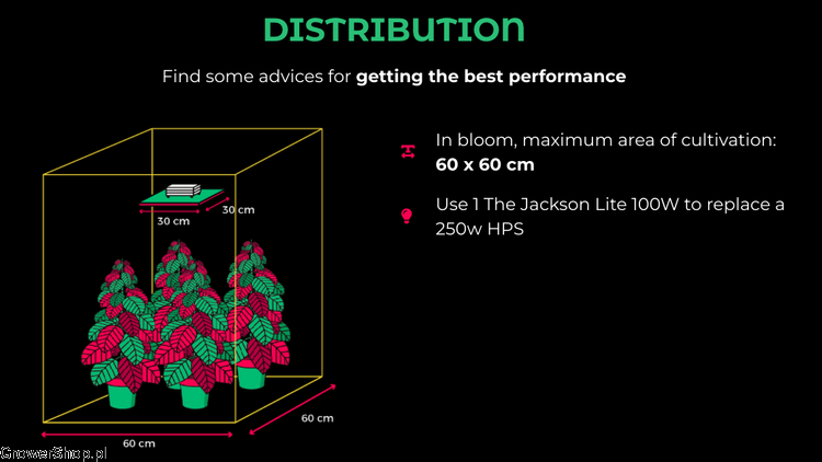 Ta lampa LED jest bardzo wydajna i dostarcza roślinom olbrzymią ilość światła. Zaleca się zachowanie minimalnej odległości między The Jackson a roślinami, aby uzyskać duże korzyści, bez szkody dla roślin.