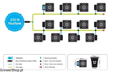Zbiornik należy umieścić min 15cm ponad doniczkami, aby ciśnienie grawitacyjne skutecznie nawadniało system. Zalecane podłoża to ziemia/kokos/wełna mineralna w stosunku 50%/50% z perlitem/keramzytem.
