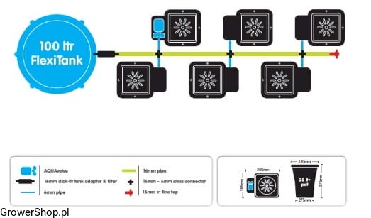 Zbiornik należy umieścić min 15cm ponad doniczkami, aby ciśnienie grawitacyjne skutecznie nawadniało system. Zalecane podłoża to ziemia/kokos/wełna mineralna w stosunku 50%/50% z perlitem/keramzytem.