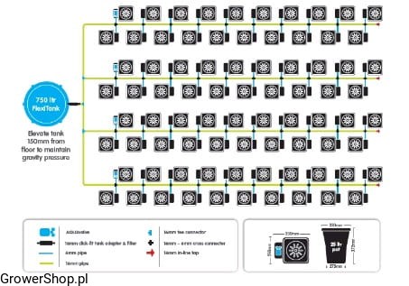 Producent zaleca stosowanie wężyków doprowadzających pożywkę o średnicy 6mm w systemach 1-7 donic. Powyżej 8-miu donic, zaleca się stosowanie wężyka o grubości 16mm. Im więcej donic w danym zestawie, tym zbiornik główny powinien być większy. Zbiornik należy umieścić min 15cm ponad doniczkami, aby ciśnienie grawitacyjne skutecznie nawadniało system. Zalecane podłoża to ziemia/kokos/wełna mineralna w stosunku 50%/50% z perlitem/keramzytem.