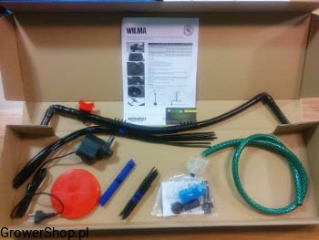 Kompletna linia dystrybucji pożywki w systemie "Wilma Small Wide". Zestaw napędzany jest pompą o mocy 13W / 1000L/h i zawiera wszystkie niezbędne akcesoria do prawidłowego nawadniania systemu.